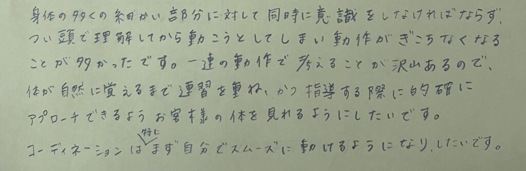 将来、体を動かす仕事がしたくて、学生のうちに資格を取ろうと決めました。最初は不安もありましたが、講師の方がとてもフレンドリーで、少人数なので質問もしやすく、楽しく通えました。マシンピラティスは思っていたよりも奥が深く、自分の体の使い方を知るきっかけになりました。修了後には自然と姿勢が良くなり、友達にも「雰囲気変わったね」と言われます。受けて本当に良かったです。