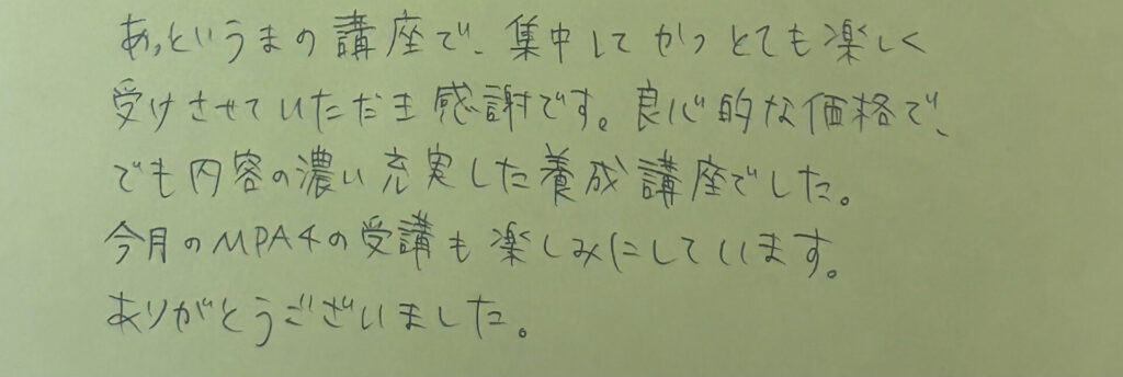 「ちょっと不安があったので、このプレセッションに申し込みました。感想は、とても先生が丁寧でわたしのことを考えてくれて、もっと学びたくなりました。結果的には安心して申込することができました。」