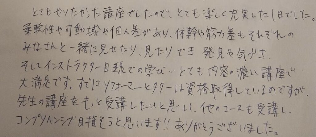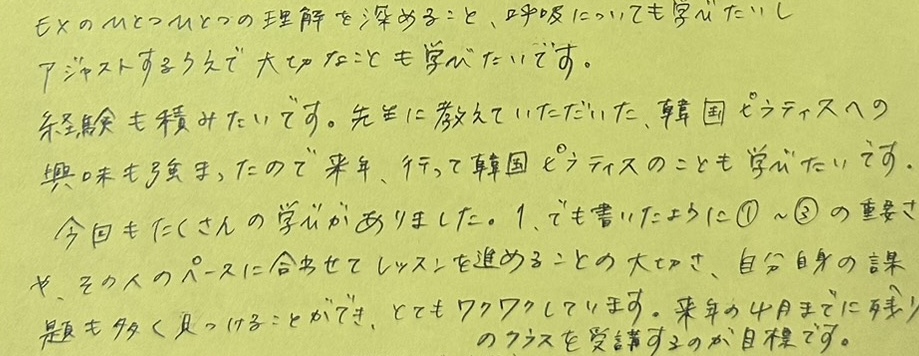「ピラティスを少しやっていて、とても興味のある講座だったので、受けたいと思っていた時に、このプレセッションを知りました。ここから始めてみようと思い、プレに申込ました。先生が「いまできることと、受けるまでにした方がいいこと」を整理してくださったので、またパーソナルで教えてくださったので、すごく安心できました。自分の身体を見てもらえて、“私でもできるかも”と思えました。」
